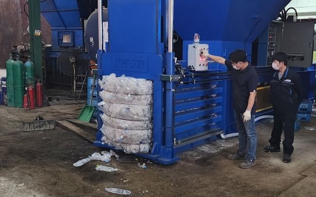 투명페트병 압축기로 투명페트병을 압축하는 모습