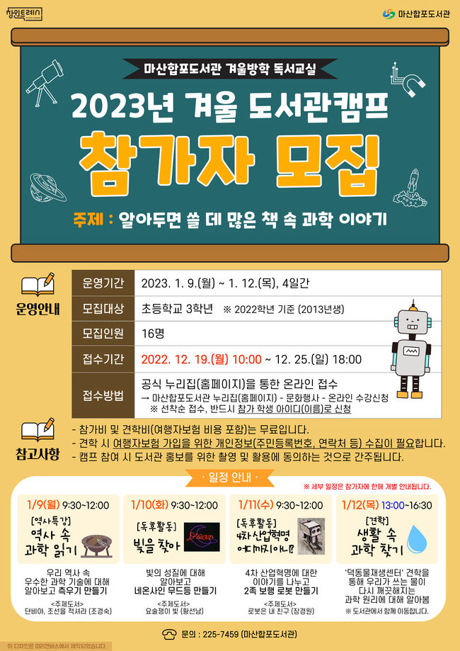 마산합포도서관은 2023년 1월 9일부터 12일까지 4일간 ‘2023년 겨울 도서관캠프’를 운영한다고 밝혔다.