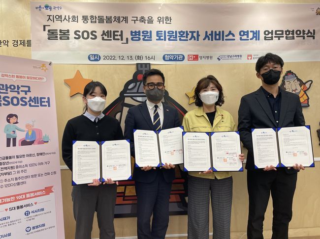 구는 서울특별시 보라매병원, 에이치플러스 양지병원, 강남고려병원 관내 의료기관 3곳과 업무협약을 체결, 12월 13일부터 ‘돌봄SOS센터 병원 퇴원환자 연계서비스’를 실시하고 있다.