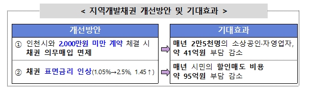 현재 인천시와 2백만 원 이상 공사·물품·용역 등 계약을 체결하는 업체는 조례에 따라 계약금액의 2%만큼 채권을 의무적으로 매입해야만 했다. 그러나 내년 1월부터는 2천만 원 미만의 계약에 대해 채권 의무매입을 면제하기로 했다. 이번 조치로 매년 약 2만5천개 업체의 소상공인 및 자영업자가 41억 원의 혜택을 받게 될 것으로 예상된다.이와 함께 2만5천개 업체의 채권매입 절차가 사라지면서 시간과 비용 절감에 따른 편의성도 대폭 향상될 것으로 기대된다.