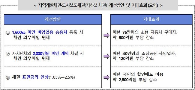 한편, 추가적인 국민 부담 완화를 위하여 일부 시·도는 소형 화물차에 대한 채권 매입 면제, 1,600cc 이상 자동차에 대한 채권 매입 요율 인하 등도 함께 추진하기로 했다.