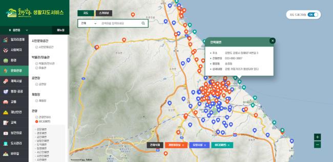 예를 들어, 강릉시에 위치한 해변에 대한 정보가 필요한 경우 ‘문화관광’ 분야에서 하위항목인 ‘바다(해변)’를 선택하면 수집되어있는 데이터를 기반으로 해변의 위치가 모두 지도 위에 표시되고 각 위치에 대한 여러 정보를 확인할 수 있다.