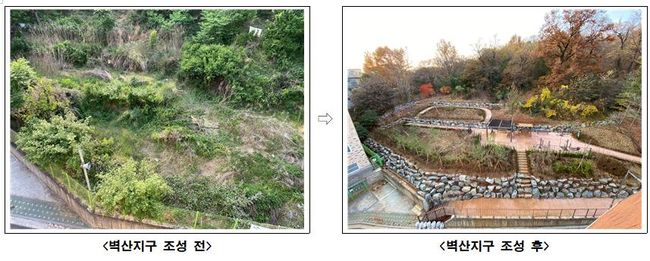 벽산지구는 산딸나무, 산수국 등 총 13종 2,898주의 나무와 맥문동 등 초화류 4종 3,648본을 식재해 녹지공간을 조성했다. 또한 등의자, 파고라 등 휴게시설을 설치하고 도로변에는 공원을 이용하는 주민들이 안전하게 보행할 수 있도록 보행로를 새로 조성했다.