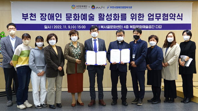 11월 9일 협약식 뒤 부천문화재단과 부천시장애인종합복지관 관계자들이 기념촬영을 하고 있다.