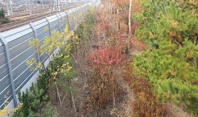 경부선 철도변 녹지대 조성 모습 구는 대기오염 발생원 주변에 도심 경관과 미세먼지 차단을 고려한 녹지대 정비를 통해 지역사회의 미세먼지 유입‧확산을 억제하고 쾌적한 생활환경을 제공한다는 계획이다.