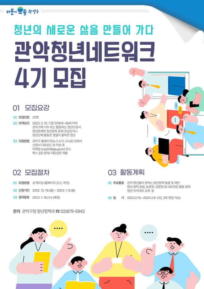 구 관계자는 “청년네트워크 참여를 통해 관악의 청년들이 주체적인 정책 파트너로서 성장할 수 있는 계기가 되기를 희망한다”며 ”내 옆집의 청년과 즐겁게 소통하며 더불어 살기 좋은 관악을 만들어 갈 뜻있는 청년들의 많은 참여를 바란다”고 말했다.