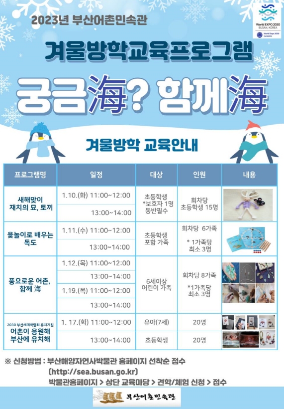 부산시 해양자연사박물관은 겨울방학을 맞아 내년 1월 10일부터 19일 중 5일간 어린이 동반 가족 등을 대상으로 2030부산세계박람회 유치를 기원하고, 어촌민속 및 해양을 배우면서 다양한 체험도 할 수 있는 ‘겨울방학 교육프로그램’을 개최한다고 밝혔다.