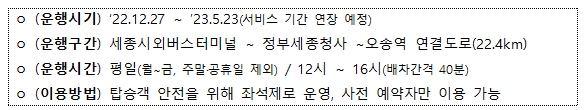 서비스는 BRT도로(세종고속시외버스터미널 ~ 오송역 구간)에서 월요일부터 금요일, 12시~16시 사이 왕복 6회 운행되며, 기존 BRT 노선 8개 정류장에 정차할 예정이다.