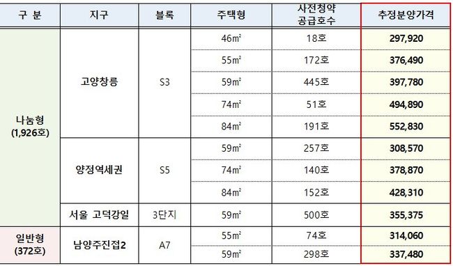 이번 사전청약은 청년 특공 등이 포함된 나눔형 도입 이후 처음 시행되는 시범사업으로, 나눔형은 고양창릉(877호), 양정역세권(549호), 서울 고덕강일 3단지(500호), 일반형으로는 남양주진접2(372호)가 공급될 예정이다.