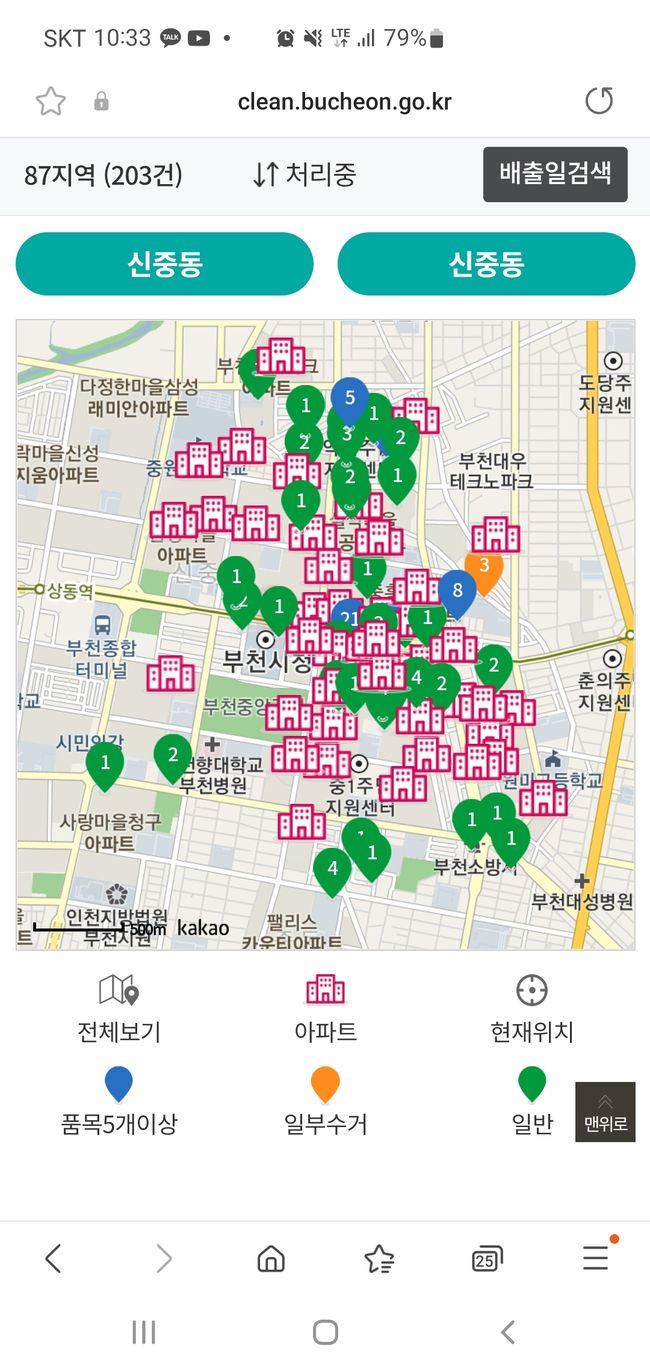 대형폐기물 현장대응시스템 화면(수거물품의 실시간 지도(맵) 위치 표시)