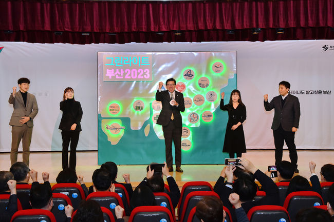 마지막으로 2023년 한해 시가 추진하는 역점 사업이 원활히 진행되기를 바라는 뜻으로 ▲2030세계박람회 부산유치 ▲가덕신공항 조기 추진 ▲15분도시 조성 ▲파워반도체 클러스터 조성 ▲지산학 협력체계 구축 등 20여 개의 역점사업들을 부산시 지도 위에 하나씩 녹색 불을 밝히는 `그린라이트 부산 2023` 퍼포먼스를 선보였다.
