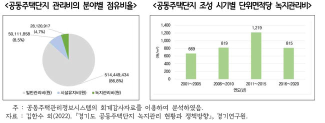 경기도 아파트 단지의 관리비 사용내역을 분석한 결과, 아파트 연간관리비의 약 4.7% 정도만 녹지관리에 사용되며, 단위 면적당 관리비도 도시공원 유지관리비의 1/4 수준(827/1㎡)에 머무르는 등 도시의 중요한 그린인프라에 적합한 대우를 받지 못하고 있는 것으로 나타났다.