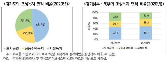 2020년 기준 경기도 내 조성녹지는 208.8㎢로 도시공원 97.8㎢, 시설녹지 63.2㎢, 아파트(공동주택단지) 녹지 47.7㎢로 구성됐다. 아파트 녹지 면적은 오산시 면적(42.7㎢) 보다 크며, 여의도 면적(2.9㎢)의 16배를 넘는다.