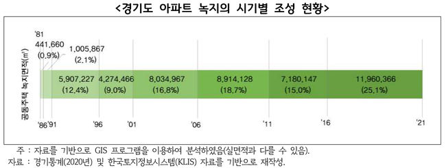 지난 20년간 36㎢ 규모의 아파트 녹지가 조성됐으며, 최근 5년간 조성된 면적은 11.9㎢로 0.2㎢ 크기 100개의 근린공원 녹지면적과 같다. 최근 급격히 늘어나는 공동주택단지 리모델링 사업, 1기 신도시 재건축, 3기 신도시 조성 등을 고려한다면 도시공원의 증가속도 보다 아파트 녹지의 증가 속도가 빠를 전망이다.