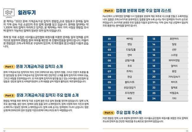 이번 가이드북에는 기계금속 집적지의 역사와 업체명, 주소, 전화번호, 주요생산품, 공정 강점 등의 업체현황이 담겨있다. 이외에도 현장감 넘치는 공정과정과 생산품 사진을 수록하여 한 눈에 보기 쉽게 구성했다.