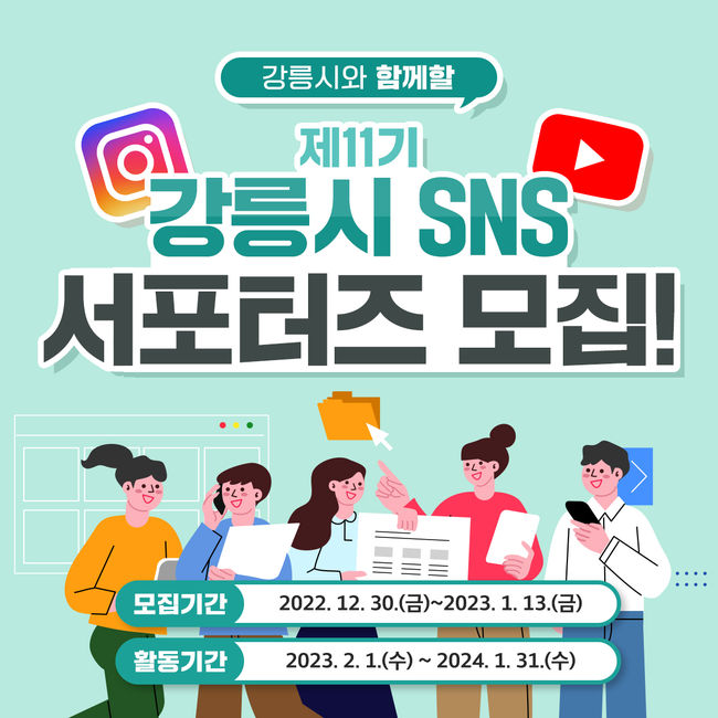 강릉시는 오는 13일까지 공식 SNS를 이끌어갈 `제11기 강릉시 SNS 서포터즈`를 모집한다고 밝혔다.