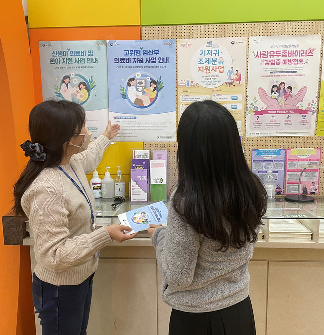양천구, 지역 산모에게 고위험 임산부 지원사업을 설명중인 보건소 직원의 모습