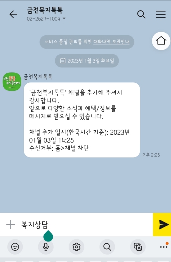 카카오톡 채널 ‘금천복지톡톡’은 전화 상담 위주의 운영에서 나아가 문자사용에 익숙한 계층의 복지상담 접근성을 높이고, 복지 사각지대 발굴을 강화하기 위해 운영하게 됐다.