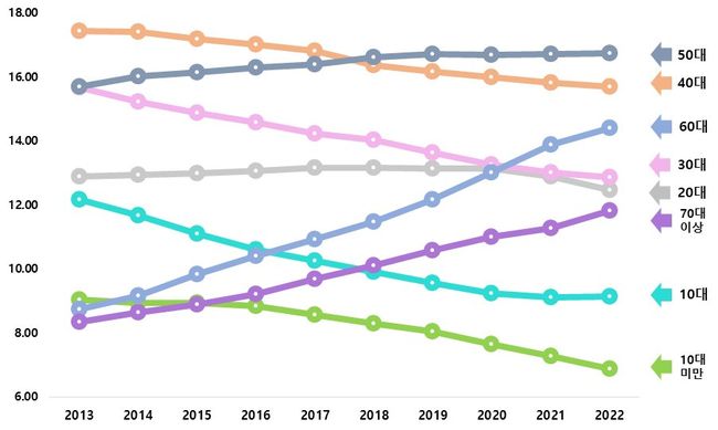 2017년 고령사회에 진입한 이후, 고령(65세 이상)인구 비중은 지속적으로 증가해 2022년말 전체 인구의 18.0%를 차지하고 있다. 또한, 고령인구 성별 비중은 여자(20.1%)가 처음으로 20%를 돌파하였으며, 남자(15.9%) 보다 4.2%p 높은 것으로 나타났다.