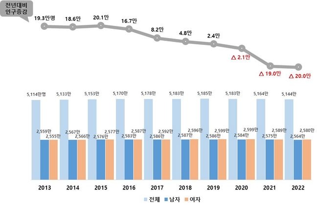 성별로 보면, 남자 인구 감소는 4년 연속 계속되었으며, 여자 인구 또한 2021년에 이어 2년 연속 감소 추세를 보였다.