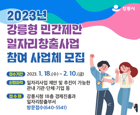 또한, 민간이 지역 현장에 필요한 새로운 일자리를 제안하면 공공이 협력ㆍ지원해주는 `강릉형 민간제안 일자리창출 지원사업`은 18일부터 2월 10일까지 강릉시청 경제진흥과(18층)에 방문 접수하면 된다.