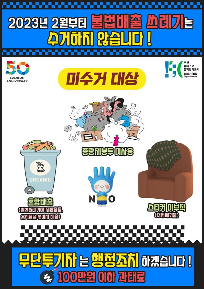 부천시는 오는 2월 1일부터 종량제봉투를 사용하지 않고 재활용품 또는 음식폐기물과 혼합 배출하는 불법 배출 생활쓰레기는 일정 기간 수거하지 않는 ‘불법쓰레기 미수거’ 시책을 추진한다고 밝혔다.