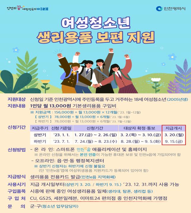 생리용품 구입비는 생리용품 전용카드를 통해서만 인천e음 지역화폐로 지급되므로 대상자는 인천e음 카드(여성청소년 전용)를 발급받아야 한다. 하반기 지원금 신청은 오는 7월에 별도로 공고된다.