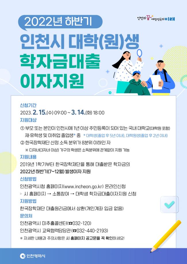 인천광역시는 한국장학재단에서 대출받은 대학(원)생 학자금대출(등록금, 생활비)의 이자지원 대상자를 내달 15일까지 접수받는다고 밝혔다. 2019년 1학기부터 대출받은 학자금의 지난해 하반기(2022년 7월부터 12월까지) 발생한 이자 전액이 지원된다.