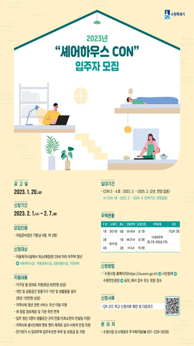 수원시가 ‘자립준비청년 셰어하우스 CON’에 입주할 자립준비청년 7명을 모집한다고 밝혔다.