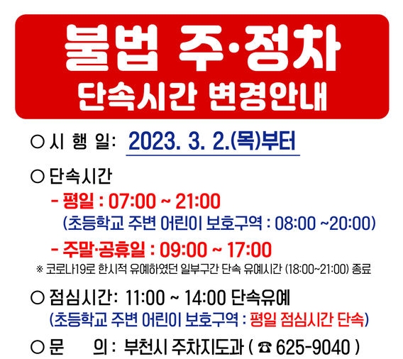 부천시는 코로나19로 침체된 지역 경제 활성화를 위해 한시적으로 단축 운영했던 불법주정차 단속 시간을 코로나19 이전으로 정상 운영한다고 밝혔다.