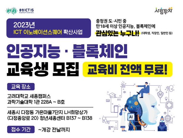 세종특별자치시가 충청ICT이노베이션스퀘어에서 인공지능, 블록체인 등 소프트웨어분야 교육생을 모집한다고 밝혔다.