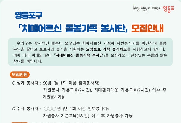 구 관계자는 “치매 어르신을 둔 가정은 24시간 돌봄으로 경제적‧정신적 부담이 크다. 이에 돌봄 공백을 메우고 치매 어르신과 가족들의 마음을 보듬어 드리기 위해 돌봄가족 봉사단을 모집한다”라며 “치매 어르신 돌봄 가족의 돌봄 부담을 경감하고 가족들의 휴식을 보장함으로써 영등포만의 복지 시스템을 만들어 나가겠다”라고 전했다.