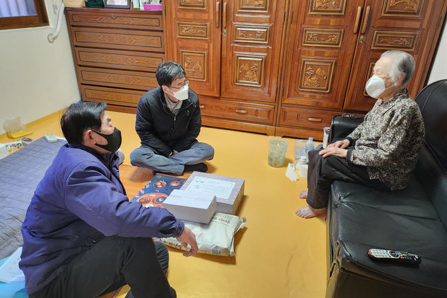 지난 설 남현동 고독사제로봉사단이 홀몸어르신께 떡국떡과 등을 방문 전달하고 있다.(사진=관악구 제공)
