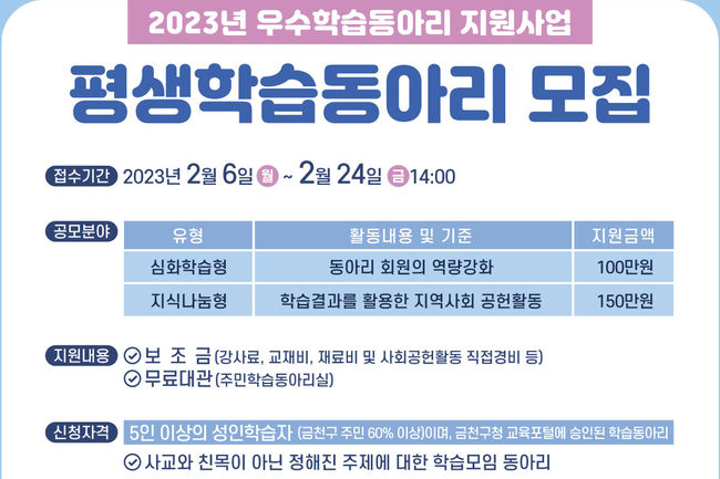 금천구는 2월 6일부터 24일까지 지역 내 학습 동아리를 대상으로 ‘2023년 우수학습동아리 지원사업’ 공모를 진행한다고 밝혔다.