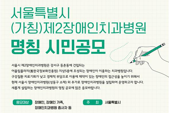 서울시가 오세훈 시장의 핵심 철학인 ‘약자와의 동행’의 일환으로 공공의료 인프라를 확충하기 위해 두 번째 건립하는 ‘장애인치과병원’의 새로운 이름을 공모한다.