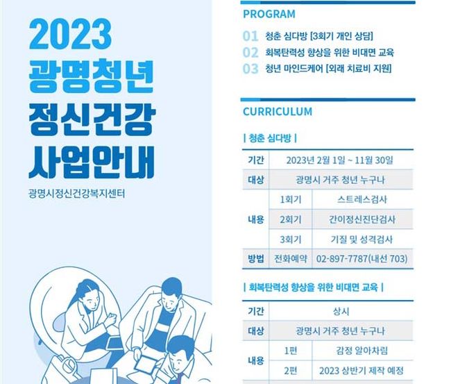 아울러, 정신건강 회복탄력성 향상을 위한 비대면 교육을 광명시정신건강복지센터 홈페이지를 통해 진행한다. 광명시 청년 정신건강 사업에 대한 자세한 사항은 전화로 문의하면 된다.
