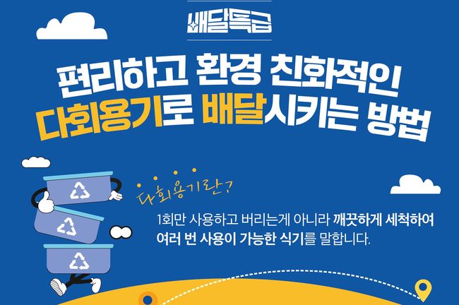 다회용기 사업은 배달특급 가맹점 음식 포장에 스테인리스 재질 용기(用器)를 사용하는 것이다. 소비자는 다회용기와 1회 용품 가운데 원하는 용기를 선택할 수 있다. 배달 음식의 가장 큰 문제점으로 지적받는 1회용품 폐기물 문제를 효율적으로 해결할 수 있는 것이 장점으로 꼽힌다.