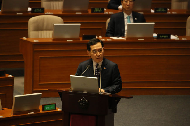 이창양 산업통상자원부 장관이 7일 오후 서울 여의도 국회에서 열린 제403회 국회(임시회) 제3차 본회의 경제 분야 대정부 질문에서 한무경 국민의힘 의원에게 난방비 관련 질문을 받고 있다.