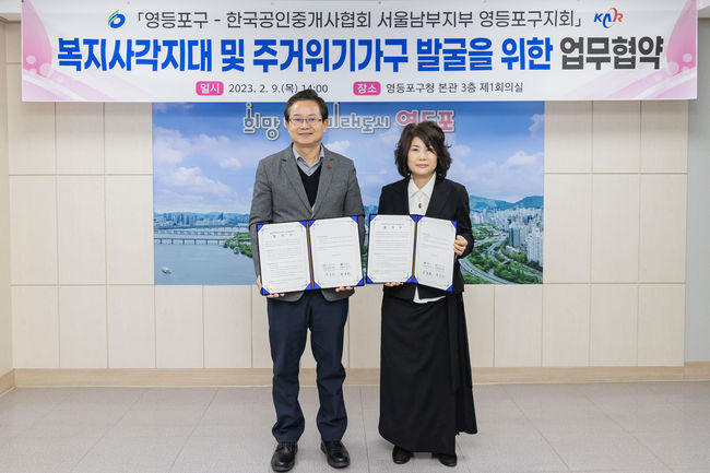 영등포구가 지난 9일 한국공인중개사협회 영등포구지회와 사회적 위기가구 발굴을 위한 명예사회복지공무원 업무협약(MOU)을 맺었다고 밝혔다.