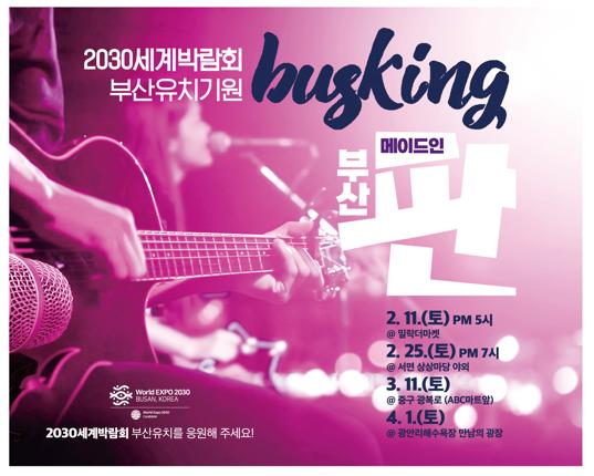 부산시는 11일 내일 오후 5시부터 6시 30분까지 수영구 밀락더마켓에서 2030부산세계박람회 유치기원 버스킹 ‘메이드 인 부산판(made in 부산판)’을 개최한다고 밝혔다.