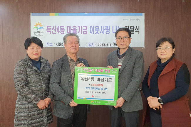 유성훈 금천구청장은 “어려운 시기에도 기금을 후원해주신 주민들과 꾸준한 나눔을 실천하는 독산4동 마을기금 운영진에게 감사드린다”며, “앞으로도 온정이 넘치는 지역사회를 만들기 위해 최선을 다하겠다”고 감사 인사를 전했다.
