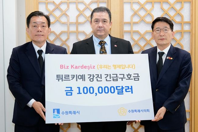 이재준 수원시장 · 김기정 수원시의회 의장, `고통받는 튀르키예 형제들이 다시 희망을 찾을 때까지 함께하겠다` (사진제공=수원시청)이재준 시장과 김기정 의장은 “지진으로 고통받고 있는 튀르키예 형제들이 다시 희망을 찾을 때까지 수원시와 수원시의회가 함께하겠다”며 긴급구호금 10만 달러(약 1억 2600만 원)를 전달했다.