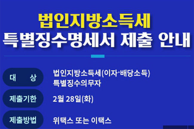 박허준 부과과장은 "법인지방소득세 정산, 환급 등이 원활히 추진될 수 있도록 특별징수의무자는 많은 관심을 갖고 기한 내 제출해 주시길 바란다"며 "투명하고 효율적인 조세업무 처리와 납세자 편의 제고를 위해 더욱 힘쓰겠다"고 전했다.