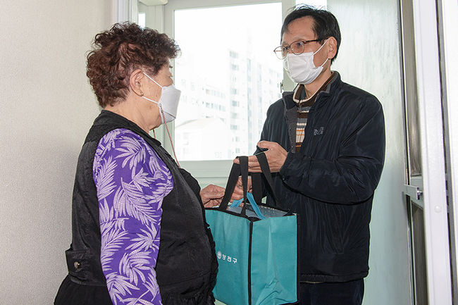 저소득 어르신에게 도시락을 배달하는 모습(사진=양천구청 제공)