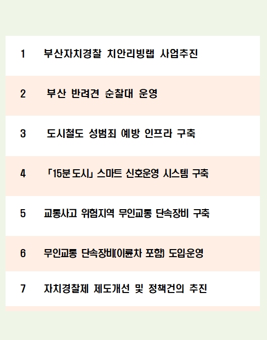 먼저, 2023년 주민체감형·생활밀착형 치안사업 추진으로 더욱 촘촘한 시민안전망을 구축해 나갈 계획이다. 주민참여와 호응도가 높은 ▲치안리빙랩 ▲반려견 순찰대 운영 사업을 확대 추진하고, ▲도시철도 성범죄 예방을 위한 안심거울·여성화장실 안심스크린 등을 설치하여 범죄심리 차단과 인프라 구축을 강화해 나간다. 2030부산세계박람회 유치를 위한 글로벌 안전도시 구축을 위해 ▲「15분도시」 스마트 신호운영 시스템 구축, ▲교통사고 위험지역 무인교통 단속장비 구축, ▲무인교통 단속장비(이륜차 포함) 도입․운영 등 교통사고 예방 및 시민 안전을 강화해 나간다는 방침이다.