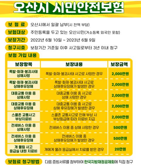 현재 오산시 시민안전보험 보장범위는 ▲폭발·화재·붕괴 상해후유장해·상해사망 ▲대중교통 및 전세버스 이용 중 상해후유장해·상해사망 ▲스쿨존 교통사고 부상치료비 ▲개물림 사고 응급실 내원치료비 등 8개 항목으로 최대 2,000만원까지 보장된다.