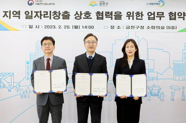금천구는 2월 20일 오후 2시 금천구청 소회의실에서 고용노동부 서울관악지청, 노사발전재단 서울지사와 지역 일자리 창출 상호 협력을 위한 업무협약을 체결했다.