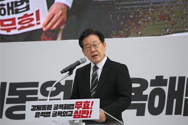 이재명 더불어민주당 당대표가 "윤석열 정권의 치욕적 강제동원 배상안이 다시 일본에 머리를 조아리는 그런 굴욕적 모양을 만들어내고 있다"며 "피해자들의 상처에 다시 난도질을 한 꼴"이라고 강력하게 규탄했다.