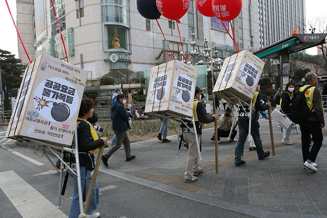 전국민주노동조합총연맹(민주노총) 공공운수노조 서울지역본부가 "공공요금이 오르는 이유는 정부 정책의 실패와 정부의 재정지원 부족이 공공요금 폭탄의 주범"이라며 정부의 공공요즘 인상 철회를 촉구했다.