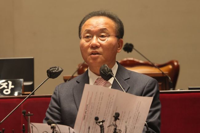 국민의힘 윤재옥 원내대표가 17일 서울 여의도 국회에서 열린 당 의원총회에서 발언을 하고 있다.